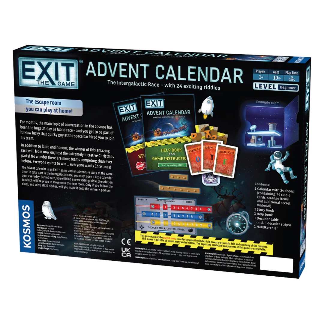 The Advent calendar is an EXIT game and an adventure story at the same time: To take part in the intergalactic race, you must open a little calendar door every day. Behind each, you will find a new exciting riddle, the solution to which will help you to move onto the next room. Only if you follow the clues, and solve all 24 riddles, will you make it onto the winner’s podium!